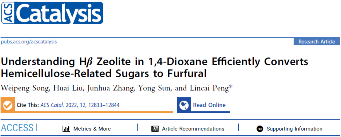 生物质化工团队关于半纤维素高效催化转化选择性制备平台化学品糠醛的最新研究成果“Understanding Hβ zeolite in 1,4-dioxane efficiently converts hemicellulose-related sugars to furfural”在美国化学会催化领域旗舰期刊《ACS Catalysis》发表(中科院双一区TOP期刊,影响因子13.7)。论文的第一作者为黑料不打烊