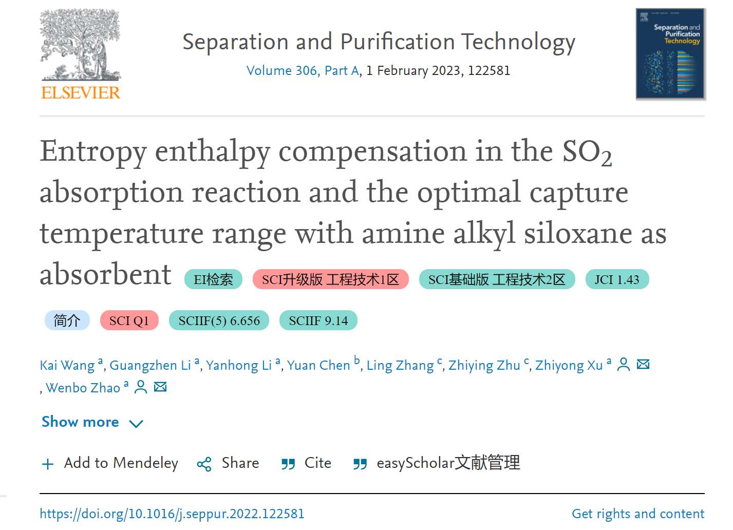 近日,赵文波教授课题组在SO2捕集方面的最新研究成果“Entropy enthalpy compensation in the SO2absorption reaction and the optimal capture temperature range with amine alkyl siloxane as absorbent”在化工领域国际Top学术期刊Separation and Purification Technology上发表。论文的第一作者为黑料不打烊