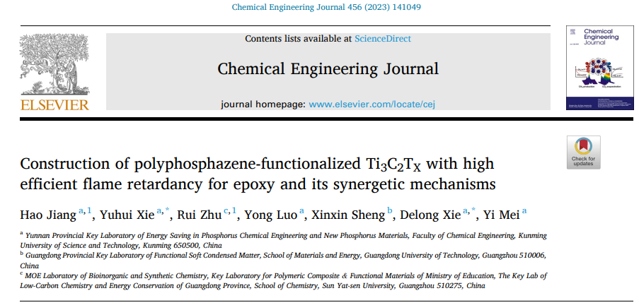 磷化工团队在MXene基协同阻燃体系的设计和机理研究中取得新进展。通过磷腈(PZN)在MXene(Ti3C2TX)表面的原位聚合反应,成功制备了磷氮改性的MXene基高效协同阻燃体系(MXene-PZN);并以MXene-PZN为阻燃功能填料,实现了对环氧树脂(EP)基材热稳定性、机械性能、阻燃性能的全面提升。结合热重、热重-红外联用、SEM、XPS等分析测试方法,重点研究了EP/MXene-PZN复合材料在燃烧的不同阶段所进行的反应和相关的产物结构分析,明确了MXene-PZN在聚合物基材燃烧过程中发挥的协效阻燃机制,包括PZN对Ti3C2TX片层结构的保护机制、Ti3C2TX与PZN的协同催化成炭机制等。该研究进一步明确了磷系改性MXene体系的协同阻燃机制,从而能够为MXene基高效阻燃体系的设计,尤其是磷氮改性MXene基阻燃体系的设计提供更好的理论指导。