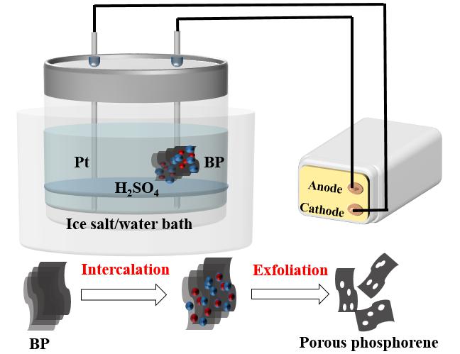 磷化工团队首次报道了新型纳米黑磷——打孔黑磷烯及其电池辅助法制备(论文链接:Electrochemistry Communications, 2019, 98: 124-128),丰富了纳米黑磷的种类,为纳米黑磷应用领域的拓宽奠定了一定的基础。但前期报道的电池辅助法存在制备方法复杂、产量低等问题,限制了打孔黑磷烯的应用。基于此,团队新开发了低温电化学辅助法用于制备新型纳米黑磷——打孔黑磷烯,该制备方法简单、高效,一定程度上实现了打孔黑磷烯的批量制备,且能实现打孔黑磷烯孔径的调控,为打孔黑磷烯在膜分离、储氢等领域的应用奠定了有益基础。