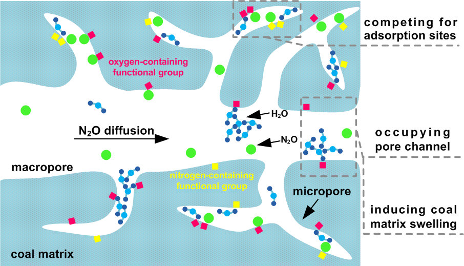 张登峰教授课题组先前已探究了富氧燃煤烟气关键组分一氧化二氮(N2O)于干燥煤样体上的吸附和解吸行为。基于上述工作,本研究将水分对流体吸附和解吸的影响纳入考察范围,具体探究水分对煤层封存N2O的影响。