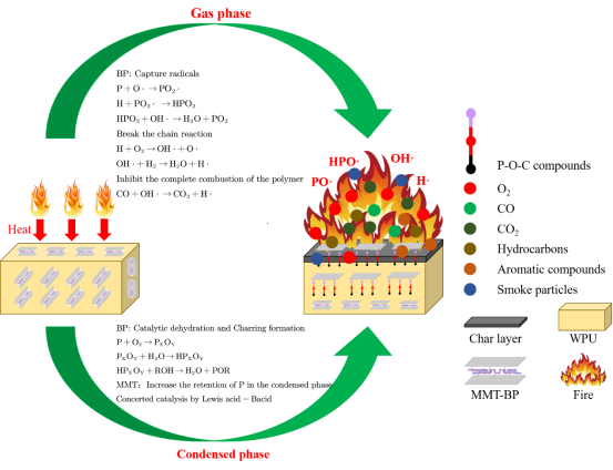 磷化工团队采用液相插层法合成了一种由蒙脱石改性黑磷纳米片(MMT-BP)组成的新型磷硅协效阻燃材料。黑磷纳米片表面被蒙脱土钝化后,表现出优异的环境稳定性,在25°C水中浸泡三个月后,结构依然保持完整。MMT-BP被用于提高水性聚氨酯(WPU)的机械性能和防火安全性。测试结果表明:添加0.4%MMT-BP后,WPU复合材料在保持断裂伸长率的同时,拉伸强度提高了59.6%。此外,WPU复合材料燃烧过程中的热释放峰值、总放热量和产烟率峰值分别降低33.4%、13.8%、32.4%。结合热重、热重-红外联用、SEM、XPS等分析测试方法,重点研究了MMT-BP/WPU复合材料在燃烧过程中气相产物和凝聚相产物的化学结构演变,明确了MMT-BP在聚合物基材燃烧过程中的阻燃机理。该研究为开发基于纳米黑磷的高环境稳定性、力学性能和阻燃性能的协效阻燃体系提供一定的理论指导。