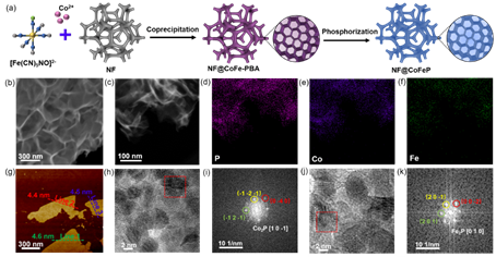 过渡金属磷化物因其价格低廉、本征活性高、导电性好且结构和组成可调,是一类非常有应用前景的HER/OER催化剂,但其电化学全解水性能还有待进一步提高。此外,过渡金属磷化物在不同电解质中的HER/OER催化机理尚不明确。基于此,本文提出了一种普鲁士蓝类似物(PBA)衍生策略,在泡沫镍基底上先合成蜂窝状超薄PBA纳米片,再通过低温磷化将PBA转化为异质Co2P-Fe2P超薄纳米片。在碱性、酸性和中性电解液中,NF@CoFeP催化HER/OER的过电位都很低。将NF@CoFeP直接作为阴/阳极构建电解水装置,其电解水性能非常优异(如:碱性条件下,10 mA cm-2的驱动电压仅为1.45 V,500 mA cm-2的驱动电压仅为1.79 V;运行50小时性能基本无衰减)。最后,通过原位拉曼光谱表征揭示了NF@CoFeP在不同电解液中的HER/OER电催化反应过程及相关催化活性组分。