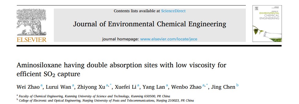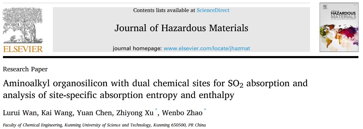 分子分离与催化赵文波教授团队在酸性气体捕集领域取得创新突破。相关研究成果以“Aminoalkyl organosilicon with dual chemical sites for SO2absorption and analysis of site-specific absorption entropy and enthalpy”和“Aminosiloxane having double absorption sites with low viscosity for efficient SO2capture”为题发表在学术期刊Journal of Hazardous Materials(论文链接://doi.org/10.1016/j.jhazmat.2023.132946)和Journal of Environmental Chemical Engineering(论文链接://doi.org/10.1016/j.jece.2023.111362)上。