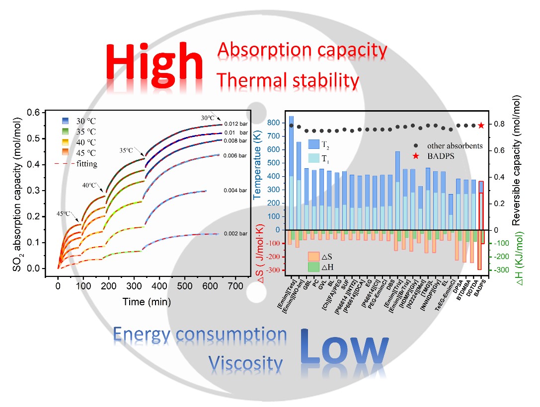 分子分离与催化团队采用了创新的方法,在胺烃基硅油吸收体系的研究基础上,通过引入苯基和双吸收位点,合成了1,5-双(二乙氨基)-1,1,5,5-四甲基-3,3-二苯基三硅氧烷(BADPS)吸收剂。该吸收剂的热稳定显著提高,而粘度显著低于离子液体等吸收剂,其双位点结构也提供了更大的SO2吸收量。通过准一阶反应速率方程式变形式,获得了吸收反应的速率常数和饱和吸收量;基于吸收动力学和热力学分析,获得了最佳吸收和解吸温度。BADPS吸收反应的吸热变化(ΔH)和熵变化(ΔS)显示报告的SO2吸收剂的最高绝对值。此文的研究丰富了胺烃基硅油脱硫体系,为酸性气体吸收剂设计和能耗分析提供了更多的思路。