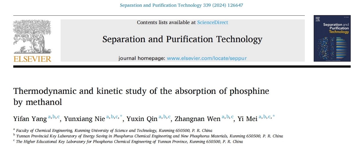 、云南省磷化工节能与新材料重点实验室在化学工程领域知名期刊Separation and Purification Technology上发表了题为“Thermodynamic and kinetic study of the absorption of phosphine by methanol”的研究论文,黑料不打烊