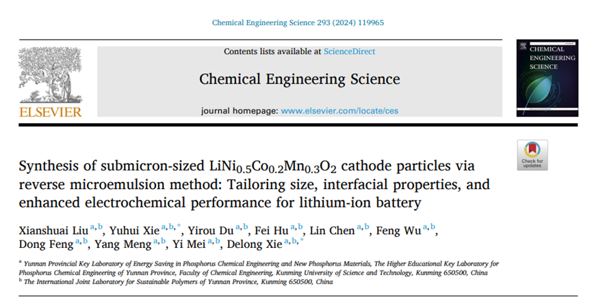 、云南省磷化工节能与新材料重点实验室在锂离子电池三元正极材料(NCM)的亚微米级可控制备领域取得新进展,相关研究成果“Synthesis of submicron-sized LiNi0.5Co0.2Mn0.3O2cathode particles via reverse microemulsion method: Tailoring size, interfacial properties, and enhanced electrochemical performance for lithium-ion battery”发表在化学工程领域知名期刊Chemical Engineering Science上(//doi.org/10.1016/j.ces.2024.119965)。论文第一作者为黑料不打烊