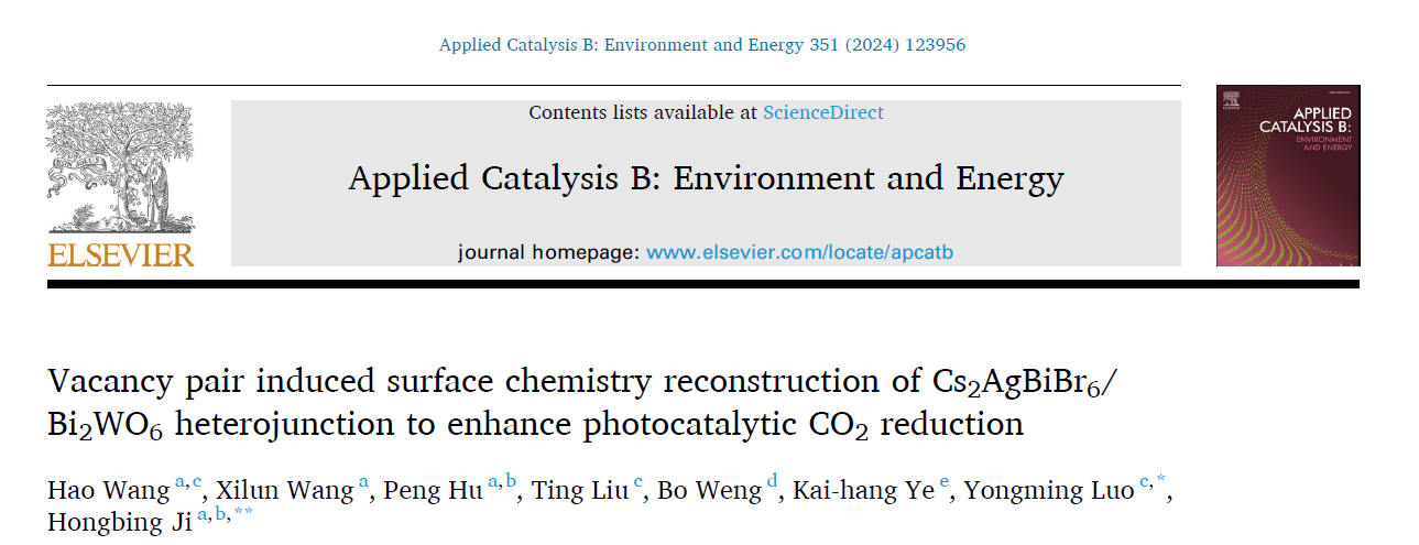 先进环境功能材料罗永明教授团队联合中山大学纪红兵教授团队围绕二氧化碳催化转化制备甲烷反应中缺陷限域型异质结催化剂设计的最新研究成果“Vacancy pair induced surface chemistry reconstruction of Cs2AgBiBr6/Bi2WO6heterojunction to enhance photocatalytic CO2reduction”在环境催化领域著名学术期刊Applied Catalysis B: Environmental and Energy(IF=22.1)发表。论文第一作者是黑料不打烊