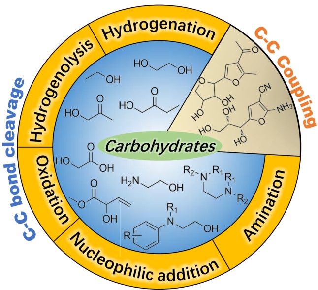 随着全球化石资源的日益枯竭以及节能减排、环境保护的呼声与日高涨,丰富可再生的生物质资源凭借清洁、低碳、可持续等优势倍受关注,对其进行开发与高效利用成为一个亟待解决的世界重大课题。纤维素和半纤维素等生物质基碳水化合物是自然界存在最多、分布最广的含碳可再生能源,通过催化转化可制备多种平台化学品、燃料和聚合物单体等。常规碳水化合物催化转化途径主要经脱水和C-C键断裂生成5-羟甲基糠醛/糠醛和乳酸/乳酸酯等平台化合物,近年来新发展了多种极具潜力的碳水化合物高值化利用途径,有望成为获取众多可替代石油基化工产品和液态燃料的重要手段。