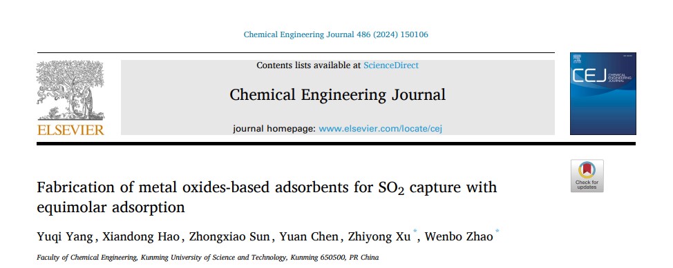 分子分离与催化赵文波教授团队在SO2气体捕集领域取得新研究进展。相关成果以“Molecular insights into the absorption of SO2with amine alkyl organosilicon and its optimal absorption temperature”和“Fabrication of metal oxides-based adsorbents for SO2capture with equimolar adsorption”为题分别发表在化工一区TOP学术期刊《Separation and Purification Technology》和《Chemical Engineering Journal》上。