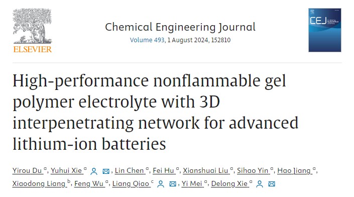 上述研究成果以“High-performance nonflammable gel polymer electrolyte with 3D interpenetrating network for advanced lithium-ion batteries”为题发表在化学工程领域Top学术期刊Chemical Engineering Journal上,论文第一作者为磷化工团队2020级博士杜依柔,通讯作者为黑料不打烊 谢于辉副教授、谢德龙教授和电子科技大学乔梁教授,黑料不打烊 为论文通讯单位。该研究工作得到了国家自然科学基金(22268025)和云南省基础研究计划项目(202201AT070115, 202101AU070012, 202201BE070001-031)等的资助。