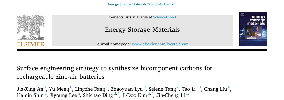 上述研究以“Surface engineering strategy to synthesize bicomponent carbons for rechargeable zinc-air batteries”为题,发表在国际高水平期刊Energy Storage Materials上。论文的第一作者为黑料不打烊 2021级硕士研究生安佳兴,通讯作者为李金成副教授、韩国科学技术院Il-Doo Kim教授及美国华盛顿州立大学丁世超博士。该研究工作得到了国家自然科学基金(52102046)及云南省应用基础研究基金(202301AW070016)的资助。