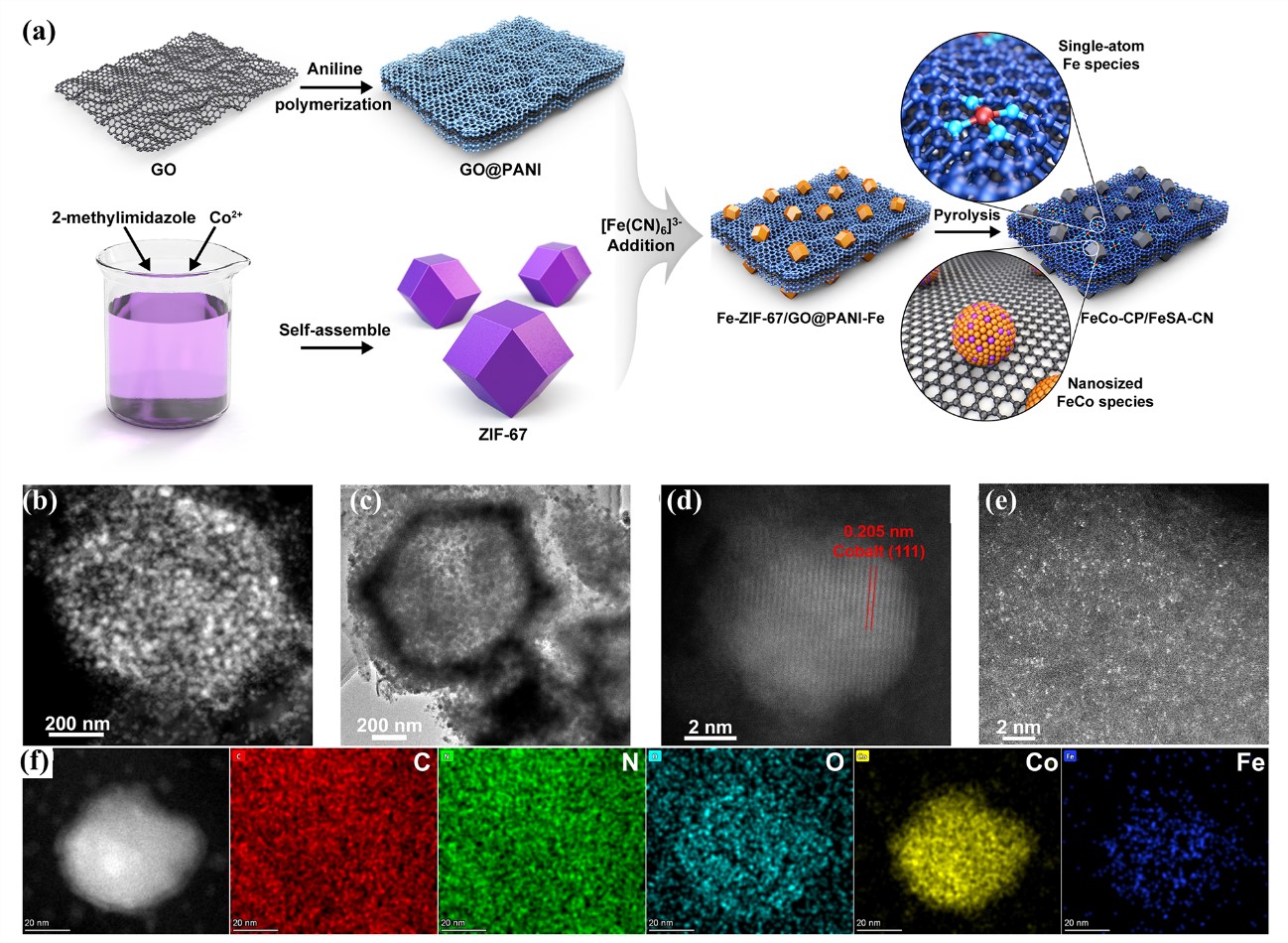 多组分碳催化剂是一类利用多尺度碳结构来担载多种催化活性组分,以促进多个化学反应的高效进行。研究表明,单原子位点(Fe-Nx或Co-Nx)和纳米FeCo颗粒分别是催化ORR和OER的高效活性组分。因此,将单原子位点和纳米颗粒锚定在不同碳结构的碳材料上,可以构建出具有复合功能的多组分碳催化剂,有望推动RZABs的商业化进程。然而,由于高温制备过程中存在奥斯特瓦尔德熟化,多组分碳同时载单原子和纳米颗粒催化剂的制备仍是一项挑战。本工作开发了一种表面工程策略,利用[Fe(CN)6]3-同时修饰聚苯胺涂层包覆的氧化石墨烯(GO@PANI)和钴基金属有机框架(ZIF-67),制备出Fe修饰前驱体(Fe-ZIF-67/GO@PANI-Fe)。高温热解中,Fe-ZIF-67转变成担载FeCo纳米颗粒的碳多面体(用于催化OER),GO@PANI-Fe转变为具有原子分散的Fe-N掺杂碳纳米片(用于催化ORR),从而同时实现高效ORR和OER(过电位差仅为0.69 V)。原位拉曼光谱揭示了其催化机理,证明了尖晶石铁钴氧化物在促进OER过程发挥了关键作用。最后,该催化剂分别在液态和固态锌空电池中实现225 mW cm-2和164 mW cm-2的功率密度,并在10 mA cm-2条件下,经过1035次充放电循环后仍能保持0.712 V的微小而稳定的电压差,这些均证明了其良好的应用潜力。