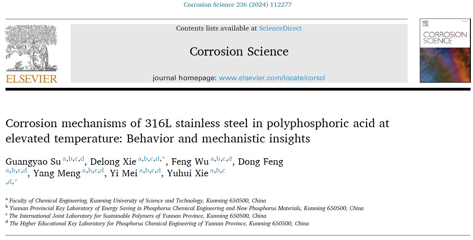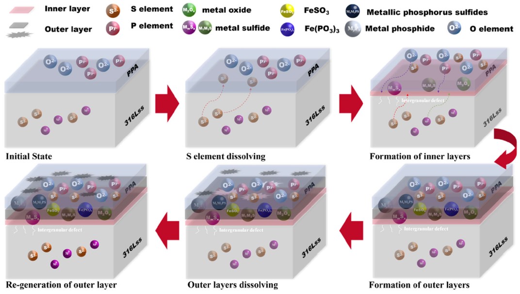 该项研究首次详细揭示了316L不锈钢在PPA中的多步骤腐蚀机制,揭示了腐蚀产物的双层结构。通过系统地探讨316L不锈钢在高温PPA中的腐蚀行为和机制,为相关工业应用提供理论基础和技术支持,有助于改进材料的选择和防腐蚀技术,从而延长设备使用寿命,提高生产安全性和经济效益。上述研究成果以《Corrosion mechanisms of 316L stainless steel in polyphosphoric acid at elevated temperature: Behavior and mechanistic insights》为题发表在材料腐蚀领域顶尖期刊《Corrosion Science》上。黑料不打烊
