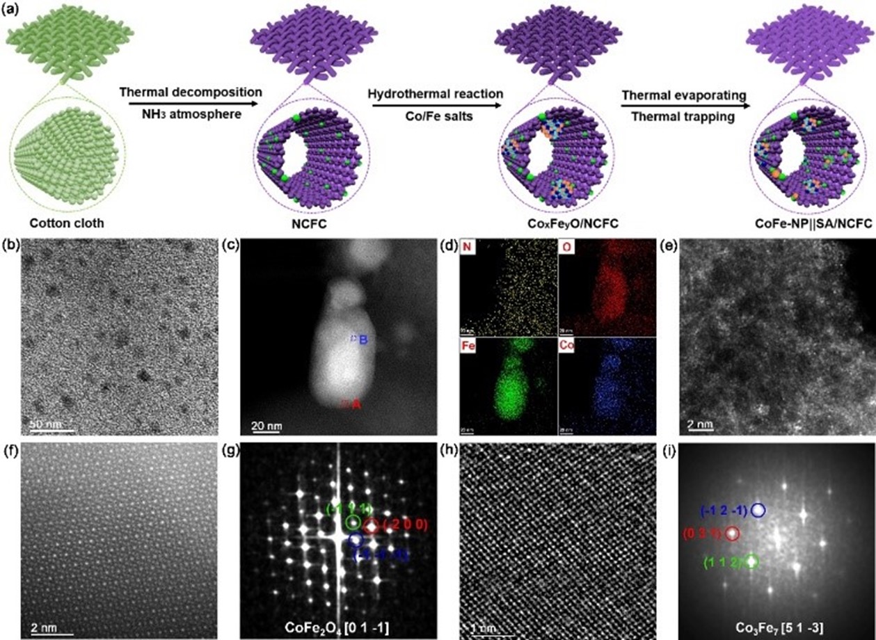 在碳基底上锚定催化活性物质是研发空气电极催化剂最有效的方法。其中,碳载单原子Fe/Co-NX团簇是一类最高效的非贵金属ORR催化剂,但其OER催化活性较低;碳载铁族双金属(CoFe,NiFe与NiCo)纳米颗粒是一类超高性能的非贵金属OER催化剂,但其ORR活性较低。因此,将单原子Fe/Co-NX团簇与双金属纳米颗粒锚定在同一碳基底上,有望实现超高催化性能的双功能ORR/OER催化剂。柔性的碳纤维布作为一种典型的碳材料,具有高的比表面积、优异的导电性能及可修饰性能,可实现反应物/产物快速扩散及电子的快速转移,在电化学储能领域展现出巨大的应用前景。