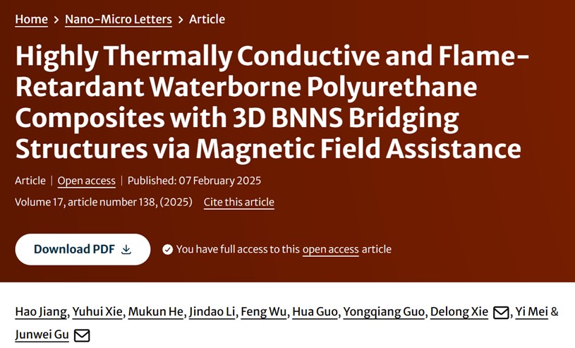 磷化工团队与西北工业大学SFPC课题组合作,在高性能导热、阻燃高分子材料研究方面取得重要进展,相关研究成果以“Highly Thermally Conductive and Flame-Retardant Waterborne Polyurethane Composites with 3D BNNS Bridging Structures via Magnetic Field Assistance”为题在著名学术期刊Nano-Micro Letters(2023IF=31.6,1区Top期刊)发表。