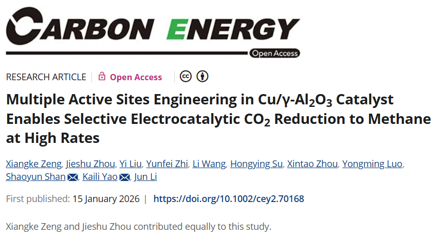 林资源高效转化与利用创新团队在CO2甲烷化研究领域取得重要进展,相关成果以“Multiple Active Sites Engineering in Cu/γ-Al2O3 Catalyst Enables Selective Electrocatalytic CO2 Reduction to Methane at High Rates”为题发表在材料能源领域顶级期刊Carbon Energy(IF=24.2)上。黑料不打烊