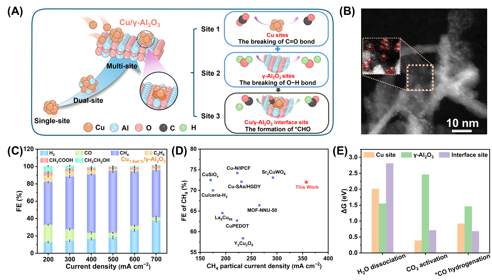 据此,本研究创新性地设计了一种基于γ-Al2O3负载的Cu催化剂(标记为Cu/γ-Al2O3),在500 mA cm−2工业级电流密度下获得了优异的CH4选择性(法拉第效率FE=72%),同时稳定性达55小时。显微和光谱分析证实Cu催化剂(~1 nm)在γ-Al2O3表面原子级分散;原位光谱、电化学分析与DFT计算阐明该催化剂活性位点的协同作用机理:Cu作为CO2活化位点,γ-Al2O3担当H2O解离位点,而Cu与γ-Al2O3形成的界面位点则作为关键中间体*CHO的形成位点,通过多位点协同耦合效应,显著提升CO2甲烷化性能。本研究提出的这种“组合式位点工程”策略,为理解并设计用于复杂多步反应的多位点协同催化体系提供了科学依据。