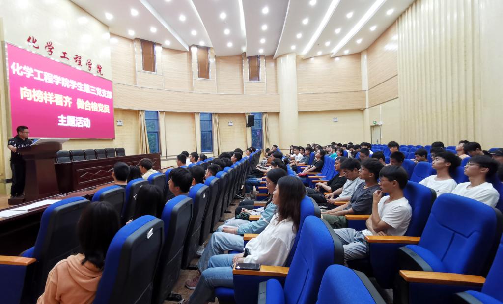 学生第三党支部在化工100报告厅开展了以“向榜样看齐做合格党员”为主题的党日活动,学生第三党支部40名党员、50名入党积极分子参加了此次活动。
