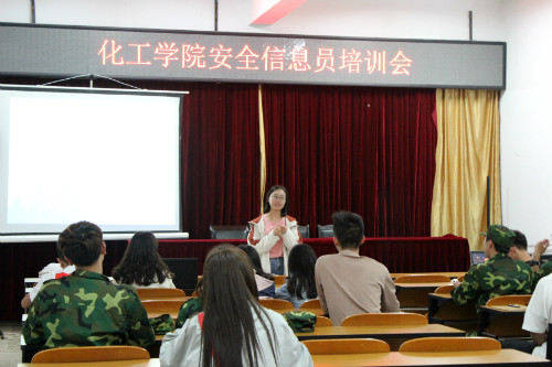 于化工楼负一楼报告厅召开了安全信息员培训会。学工办罗晓菲老师、学生党员服务队部分成员、17、18、19级全体安全信息员参加了此次会议。