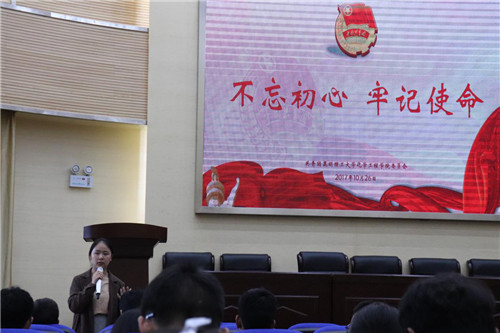 团委于2017年10月29日17点整,在化工楼100报告厅开展了以“不忘初心,牢记使命”为主题的团课。本次团课由团委金雯老师主讲,化工学院团学干部积极参加。