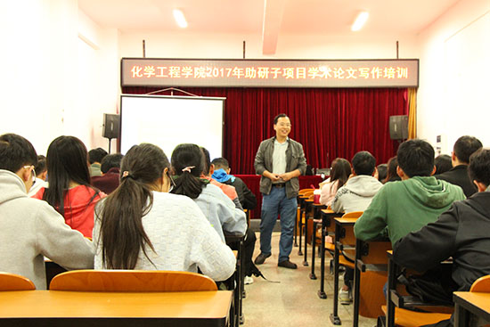 副教授赵文波老师在化工楼负一楼报告厅给本期助研本科同学进行学术论文写作培训。