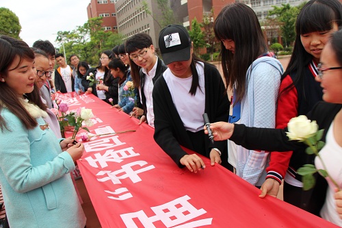 经过4月22日对志愿者进行的初步培训。初升的太阳,点缀得春色更有诗意,次日上午8:30,第一批志愿者小队前往各自的采访区域进行随机采访。在这静谧的校园里,图书馆、公交楼及一些教学楼早已有勤奋求学的读书人了。志愿者向被采访者进行提问,问题包括:今天是什么日子?您平时读什么书?书中对您影响最大的是那一句话等。之后受到采访同学会收到来自勤助会寓意“学海无涯”序号为1-423的读书接力书签及玫瑰花一枝,期望以“赠人玫瑰、手留余香”方式让被采访同学将读书以自己喜爱的方式接力下去。