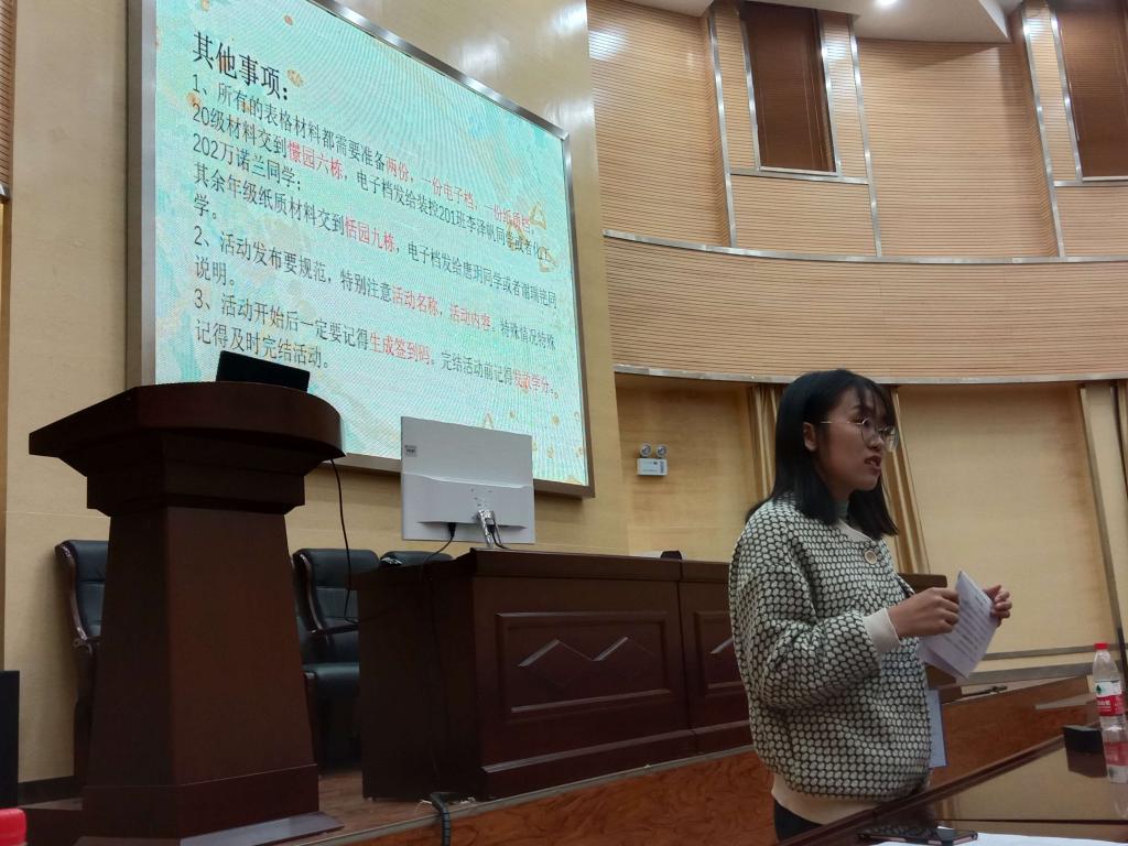 团委于2020年10月23日19点在化工100报告厅举行“到梦空间”使用培训会。化工院团委、学生会各部门负责人、院内其他学生组织负责人以及2019、2020级各班级到梦空间负责人参加。培训会由化工院团委青年事务中心负责人唐玥主持。