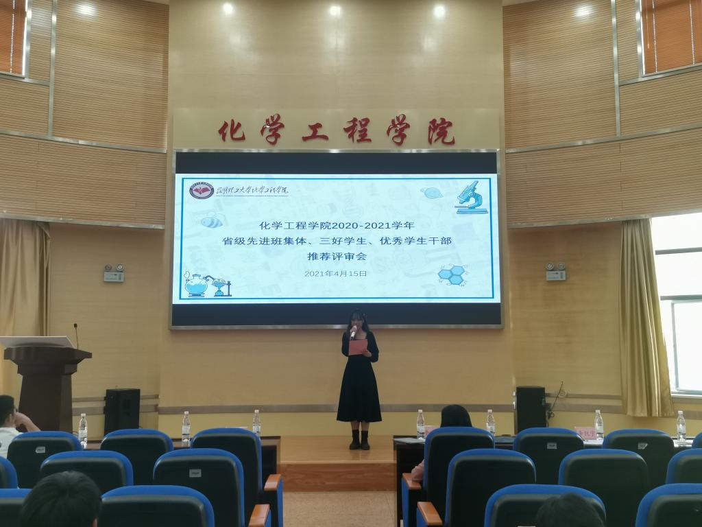 2020-2021学年省级先进班集体、三好学生和优秀学生干部推荐评审会在化工楼100报告厅举行。学院党委副书记李云燕、化工182班班主任何艳萍、学工办谢丽芬、田世垚、罗晓菲,以及来自各学生组织的4位学生代表受邀担任评委。参会的还有相关学生代表共150余人。大会由余毓兰同学主持。