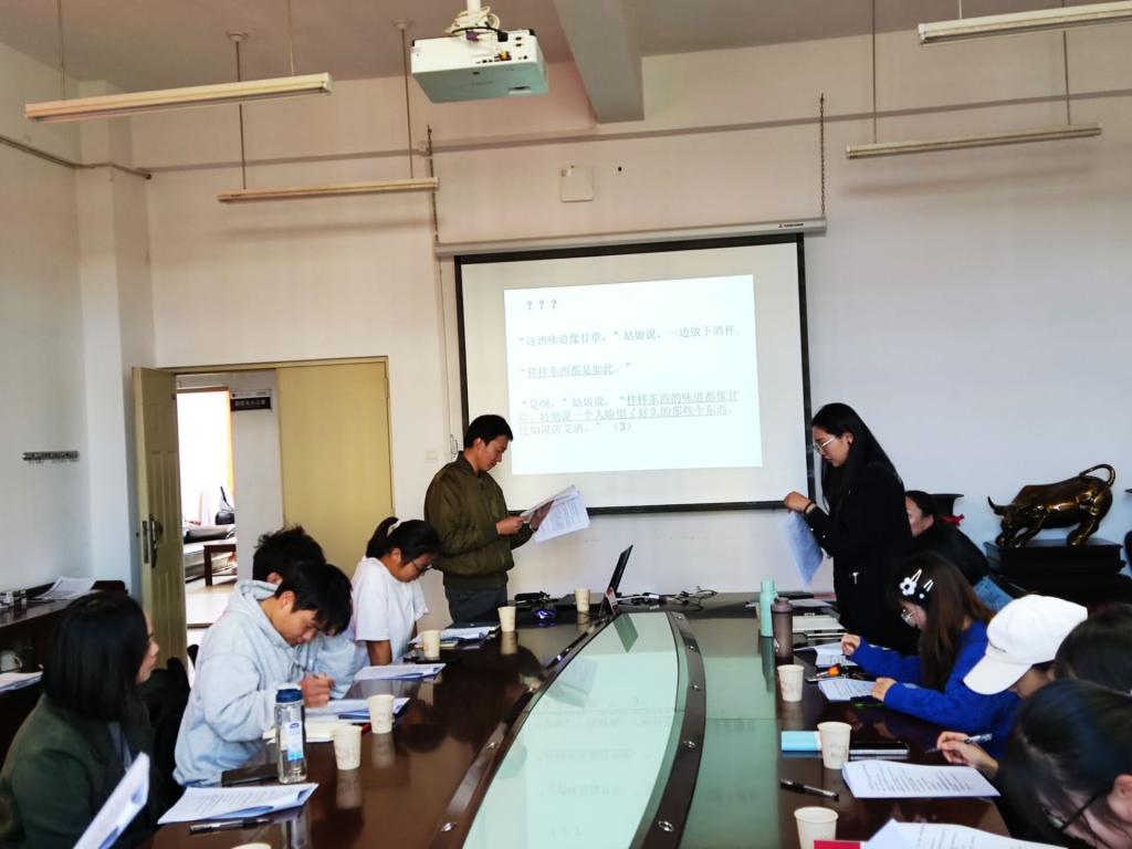 其次,石洋老师介绍了《白象似的群山》背景及故事梗概,并通过男人与姑娘的对话分别分析了人物的特点及写作的特色,老师同学积极的参与交流。