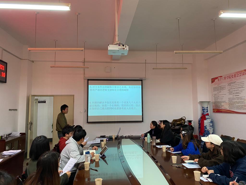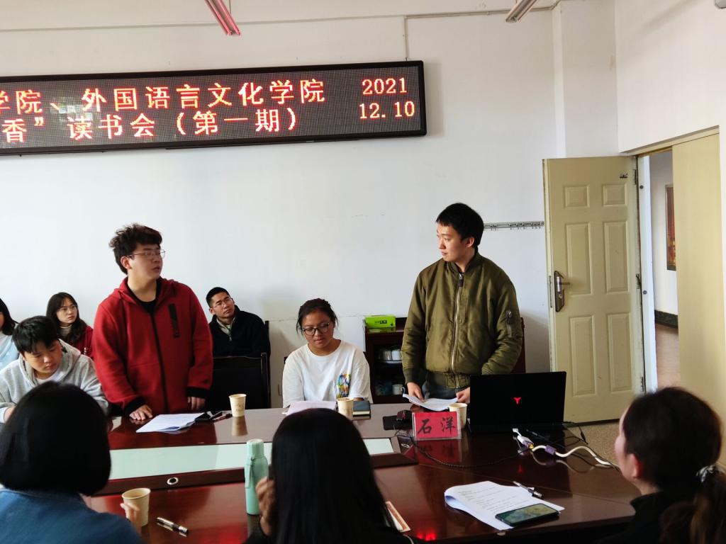 首先,石洋老师阐明了此次读书会的宗旨:“不分师生,平等交流,畅所欲言,思想碰撞”。接着石洋老师分享了自己阅读小说的思路,即了解作品的写作背景、纵观整体脉络、从不同角度分析作品中人物形象。并强调对于不理解的地方要重复性地去阅读、体会,深入思考其表达的意蕴。
