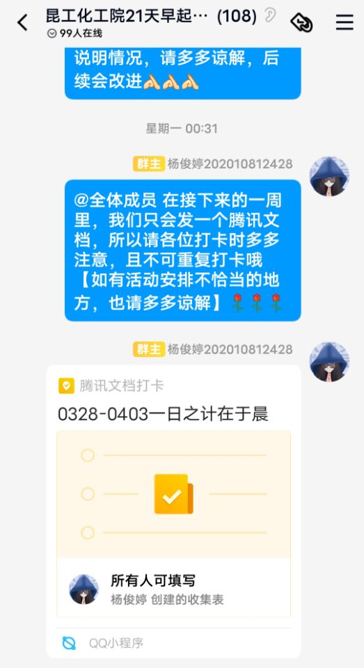 本次系列活动包含“一日之计在于晨”——21天早起打卡活动、“学以致用,强国有我”——学习强国APP打卡活动、“我是食堂支持者”——校内就餐光盘打卡活动和“青春爱运动,健康强中国”——校园跑步线上打卡活动四个内容。