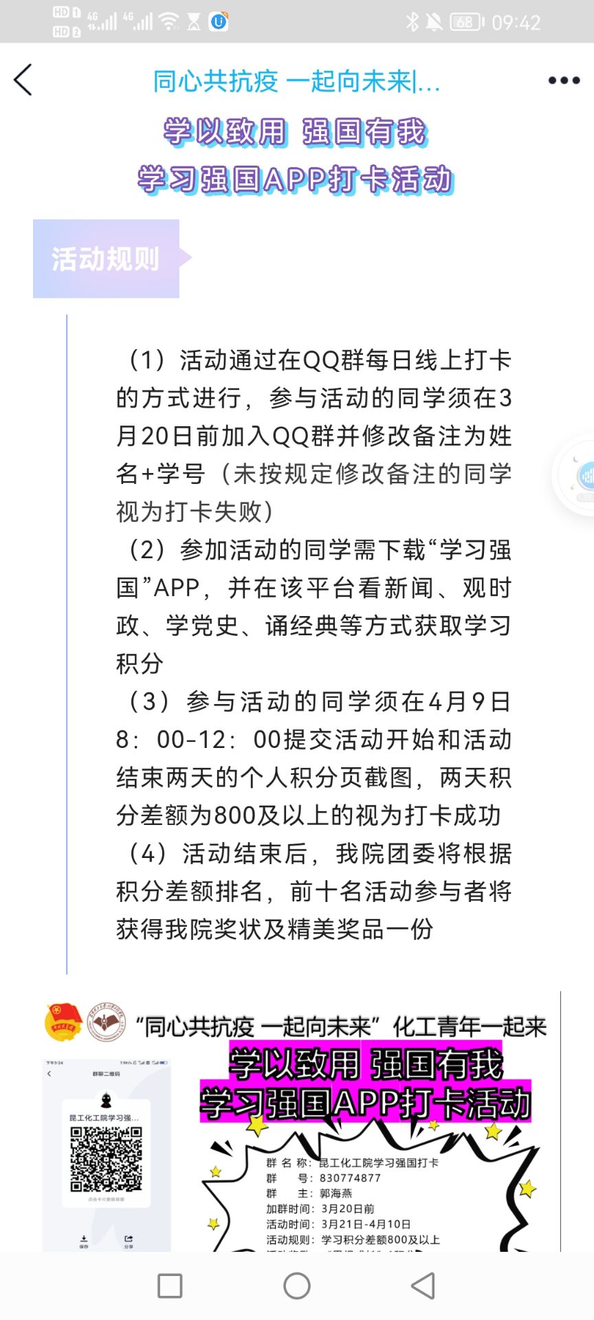 依托QQ群、微信小程序和学习强国APP等平台以线上的形式开展,结合学院特色,以第二课堂积分和文创奖品呼吁化工青年积极参与。