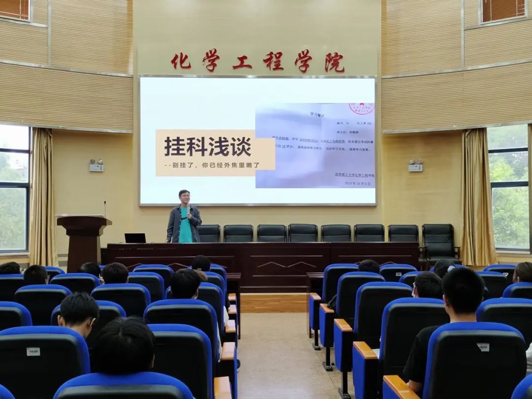 在化工楼100报告厅开展第一期“学长学姐说”活动。本次活动邀请了孙陆毅同学做分享,2021级100余名同学参与了本次活动。