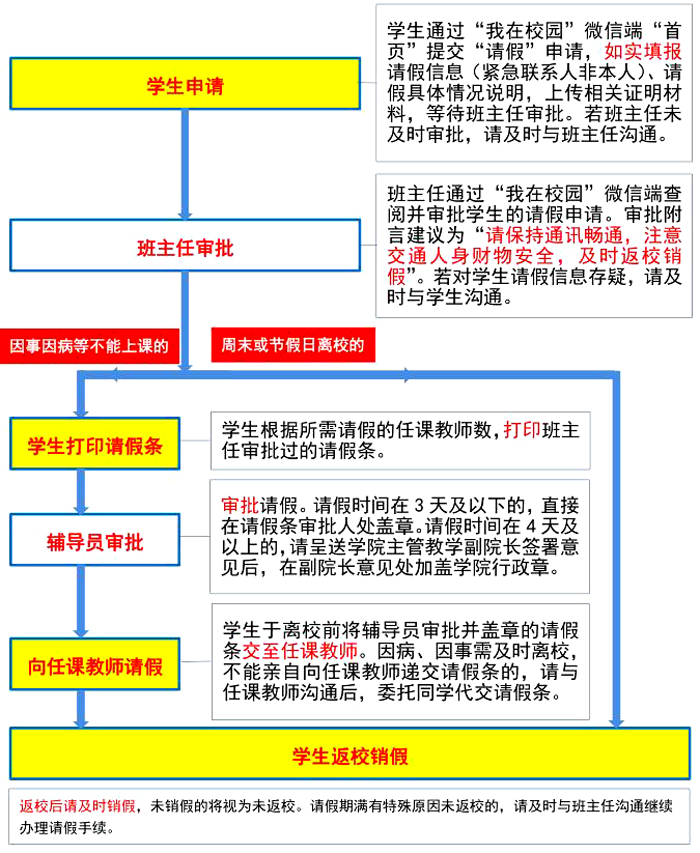 周末或节假日离校的(寒暑假另行安排),需要办理“学生申请—班主任审批—学生返校销假”手续。