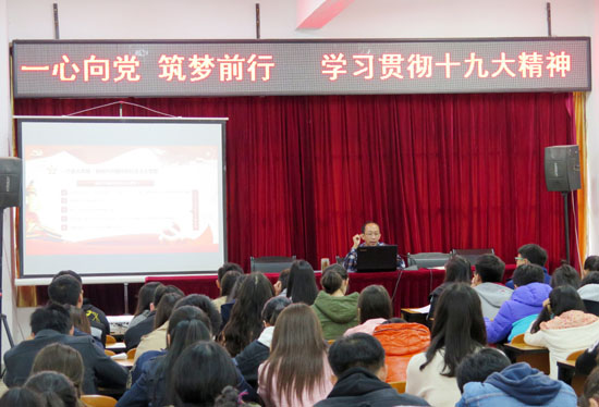 齐毅书记从师生身边事入手,理论联系实际,分析了党的十九大召开的社会背景,介绍了党的十八大以来,党和国家在经济、深化改革、思想文化、人民生活等十个方面取得的历史性成就。从历史使命、习近平新时代中国特色社会主义思想、党的领导等方面分析了中国共产党取得重大成就的原因。最后对同学们提出了殷切希望,希望同学们不忘初心,牢记使命,坚定共产主义理想信念,从学习、工作、生活的点滴做起,为社会进步、国家富强、为实现中国梦贡献自己的力量。