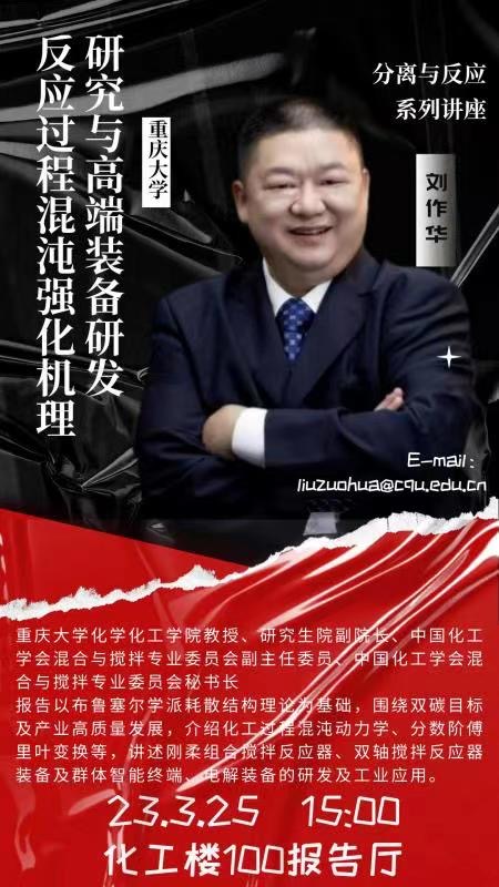 2023年3月25日下午3:00,中国化工学会混合与搅拌专业委员会副主任委员、中国化工学会混合与搅拌专业委员会秘书长、重庆大学化学化工学院博士生导师刘作华教授,应邀来黑料不打烊