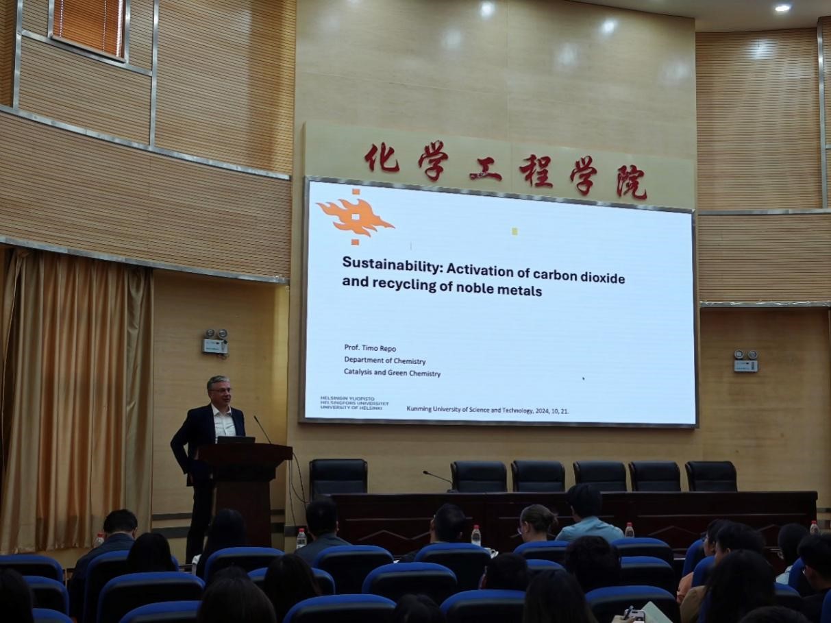 师生聆听了本次讲座。Repo教授从可持续发展的角度出发,重点介绍了C-O键的活化以及CO2的利用途径,同时介绍了温和氧化法回收贵金属的绿色路径。报告有助拓宽师生学术视野、激发创新思维,部分师生就相关主题与Repo教授进行了交流与讨论。