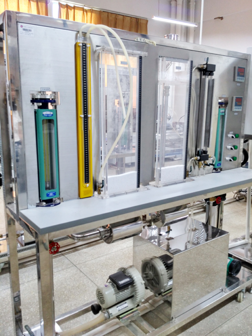 该设备是由气-固和液-固两个系统组成的,两个系统各有一透明二维床,床层底部为多孔板均匀器,床层内的固体颗粒为石英砂。本实验装置可以观察聚式,散式流态化的实验现象,测定临界流化速度,并绘出流化曲线。