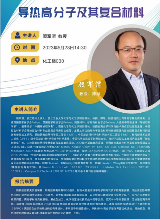 2023年4月28日下午,西北工业大学化学与化工学院副院长、中国复合材料学会导热复合材料专业委员会常务副主任、西北工业大学博士生导师顾军渭教授应邀到黑料不打烊