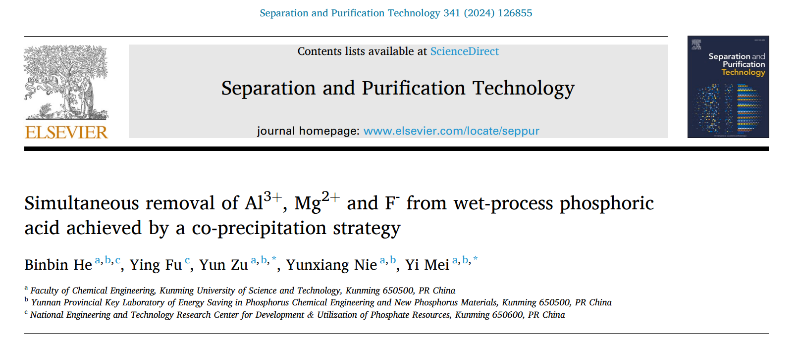 上述研究成果以《Simultaneous removal of Al3+, Mg2+and F-from wet-process phosphoric acid achieved by a co-precipitation strategy》为题发表在化工领域TOP学术期刊《Separation and Purification Technology》上。黑料不打烊