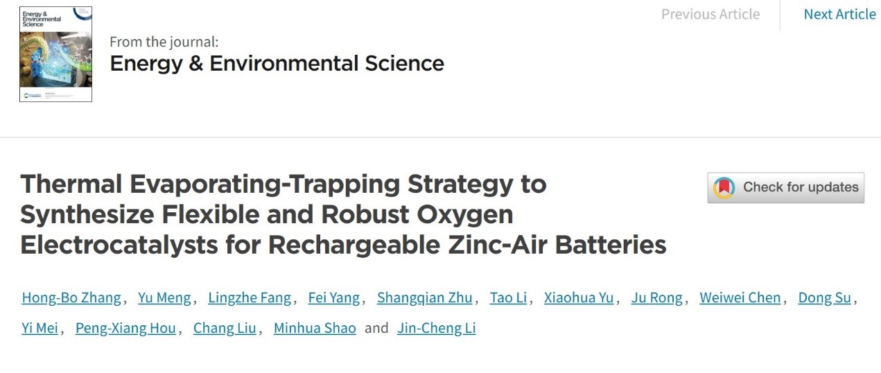 李金成副教授和梅毅教授联合多家国内外单位,在能源领域顶级期刊《Energy & Environmental Science》上发表了题为“Thermal Evaporating-Trapping Strategy to Synthesize Flexible and Robust Oxygen Electrocatalysts for Rechargeable Zinc-Air Batteries”的研究论文。